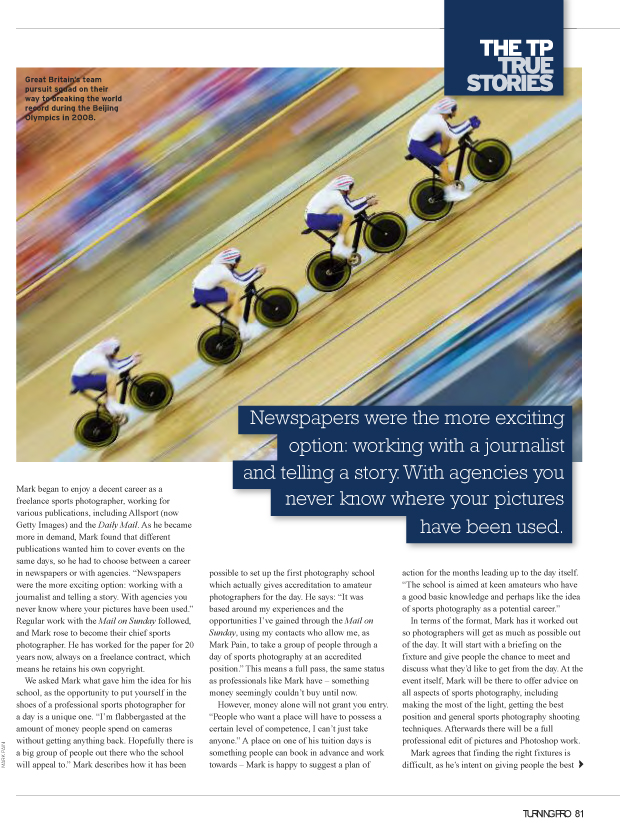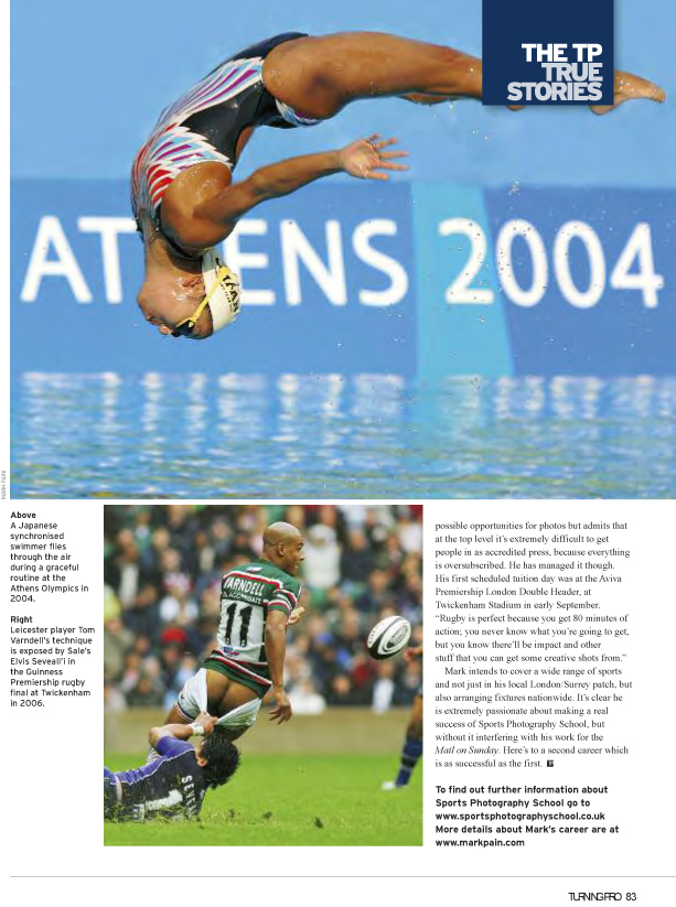Interview with internationally recognised sports photographer, Mark Pain, in Turning Pro magazine Posted on January 19, 2011 by Rachael Sharpe Published in Issue 3 of Turning Pro magazine, out now. Share this: Click to share on Facebook (Opens in new window) Facebook Click to share on X (Opens in new window) X Click to share on Pinterest (Opens in new window) Pinterest Click to share on LinkedIn (Opens in new window) LinkedIn Like Loading... Related Published by Rachael Sharpe View all posts by Rachael Sharpe