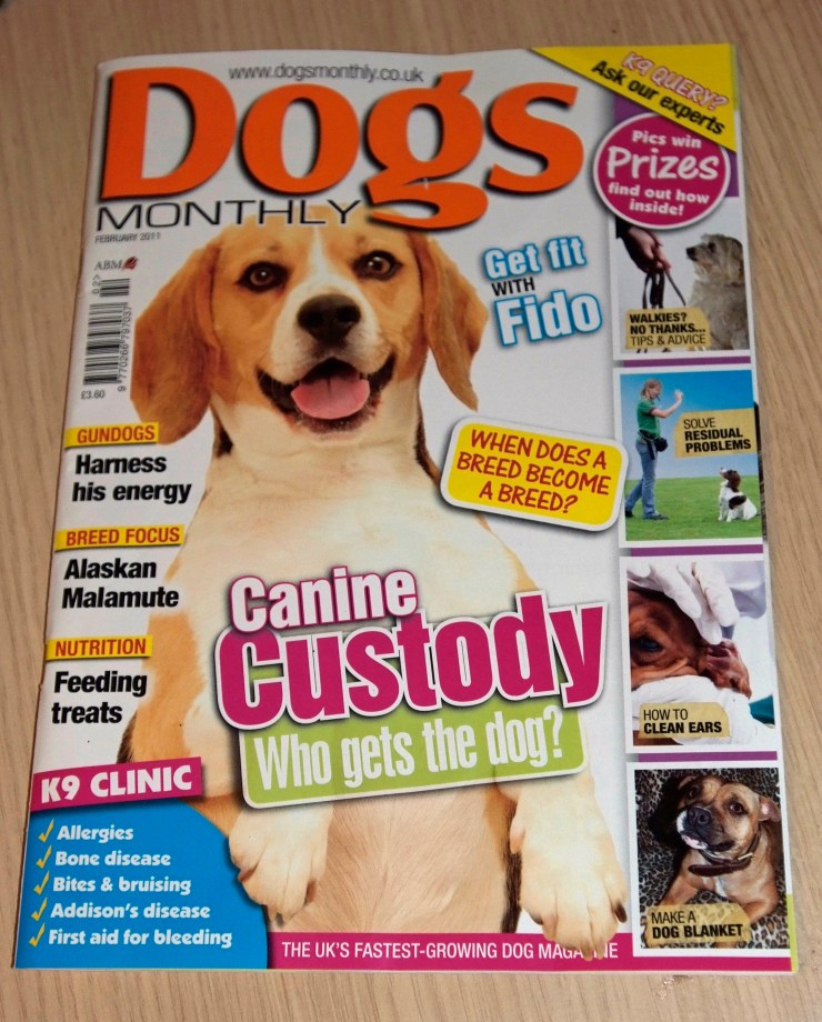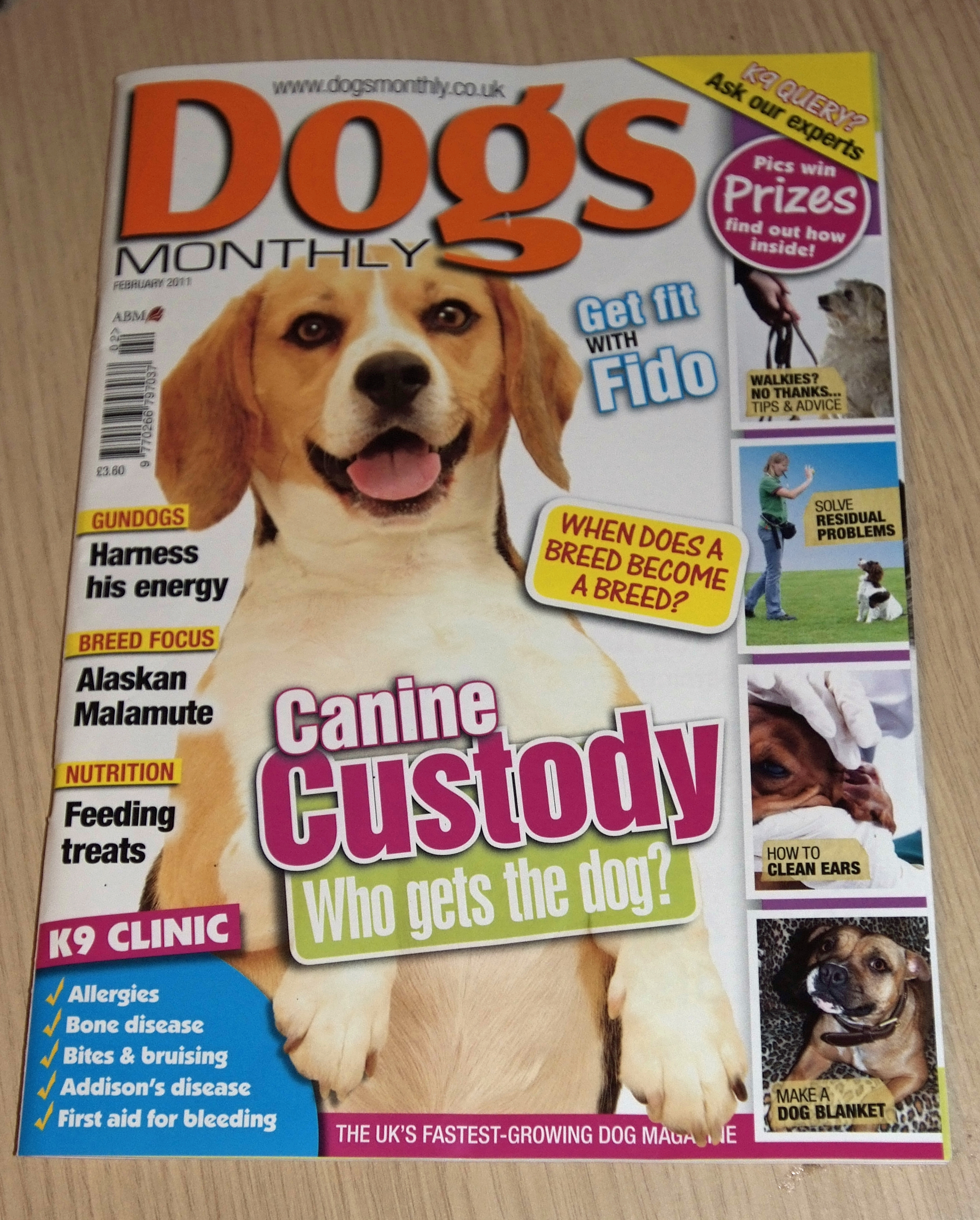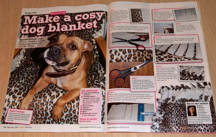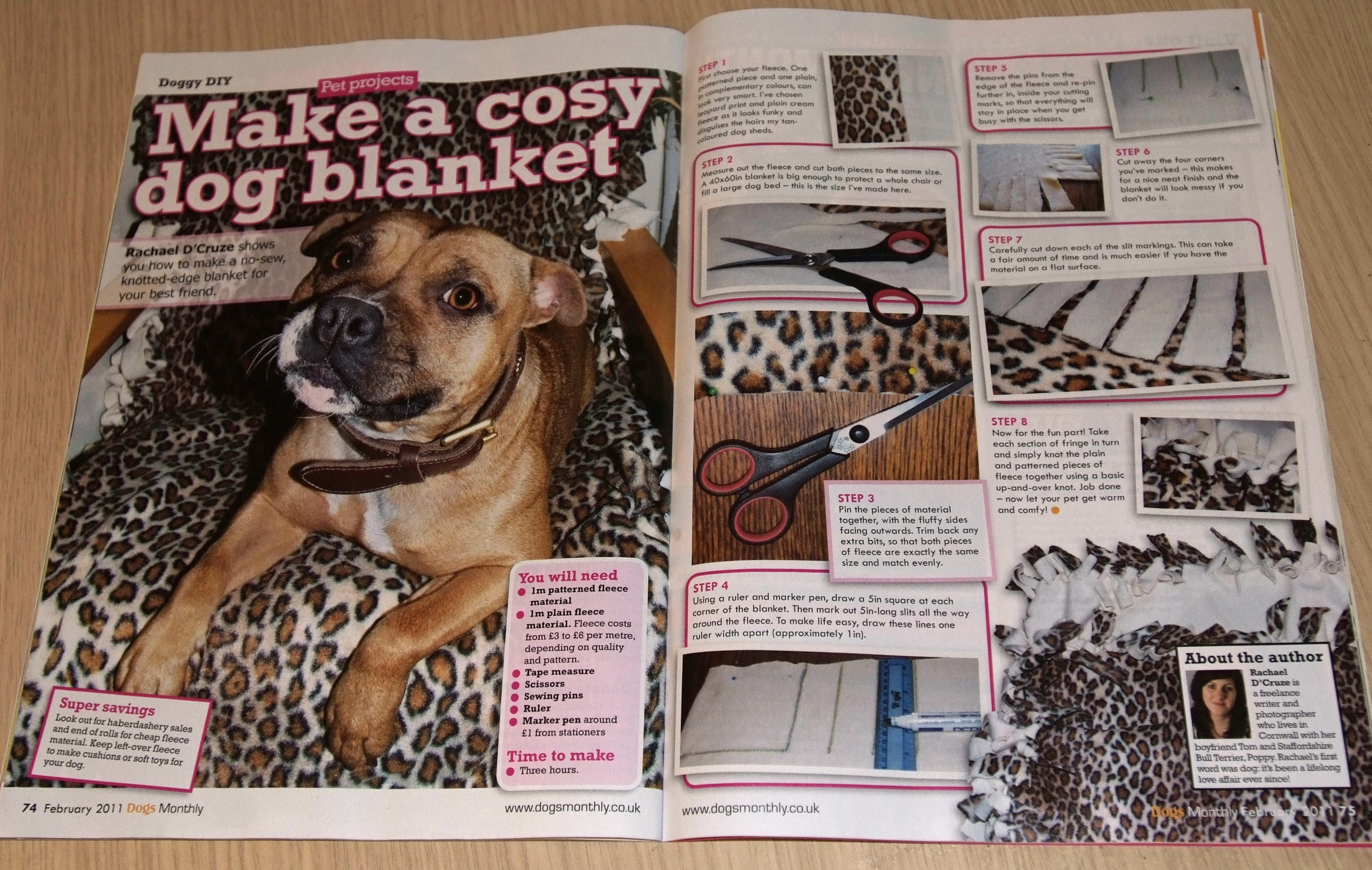 Each monthly I design a pet project for Dogs Monthly magazine, which involves making something, writing a how-to piece for readers to follow and taking photographs to illustrate the process. February’s project, making a warm and cosy no-sew dog blanket, has made it onto the cover. I’m especially pleased as my dog, Poppy, is modelling. On sale now.