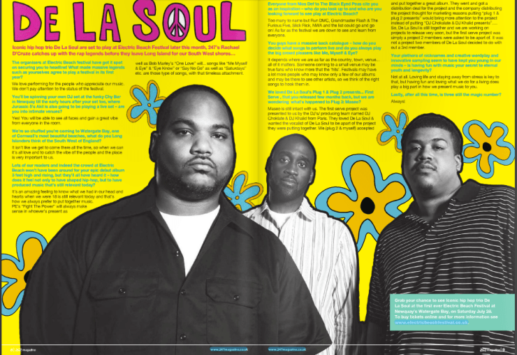Who cares if the weather’s gone schizophrenic (we’re sticking to the all-weather nautical look as seen in this month’s fashion shoot), there’s so much to be excited about in the South West this month (and lots to fill a magazine with…) – Ed Sherran, Dizzee Rascal, Zane Lowe, Pulled Apart By Horses, Modestep (read our interview with these electronic rockers here) and so many more at Boardmasters and the first ever Electric Beach festival – which is bringing De La Soul to the South West! In this issue we catch up with the hip hop icons for a UK exclusive interview… We’re got lots of other interviews for you in 247 this month, including a glimpse into the world of talented young surfer, Sophie Hellyer and a chat with Yes Sir Boss – who have just been signed to Joss Stone’s label.