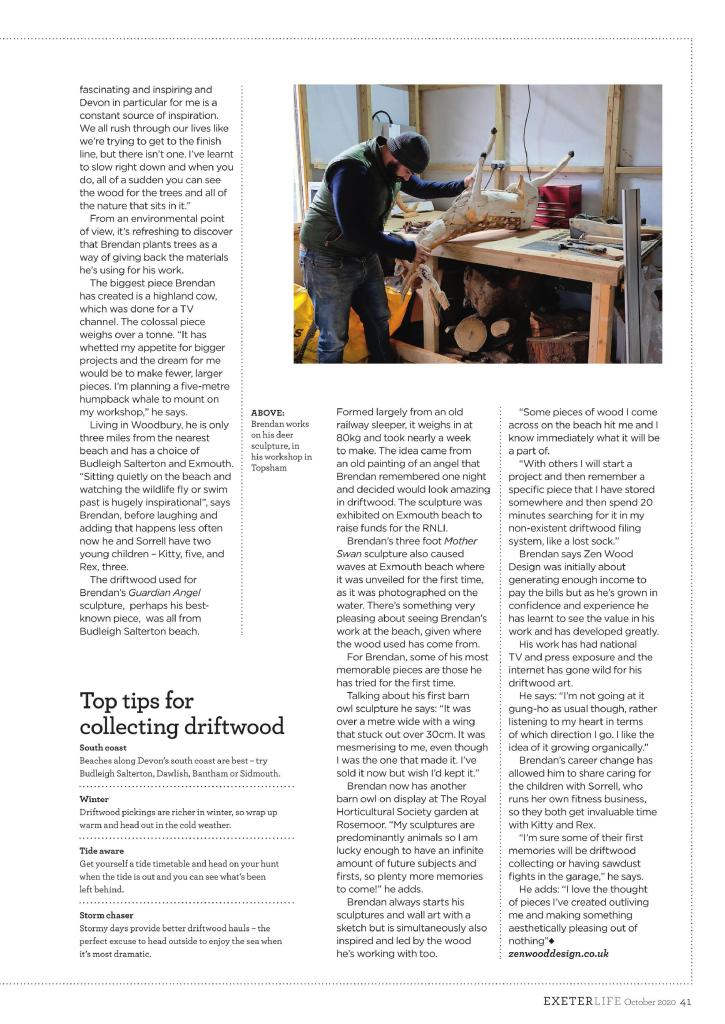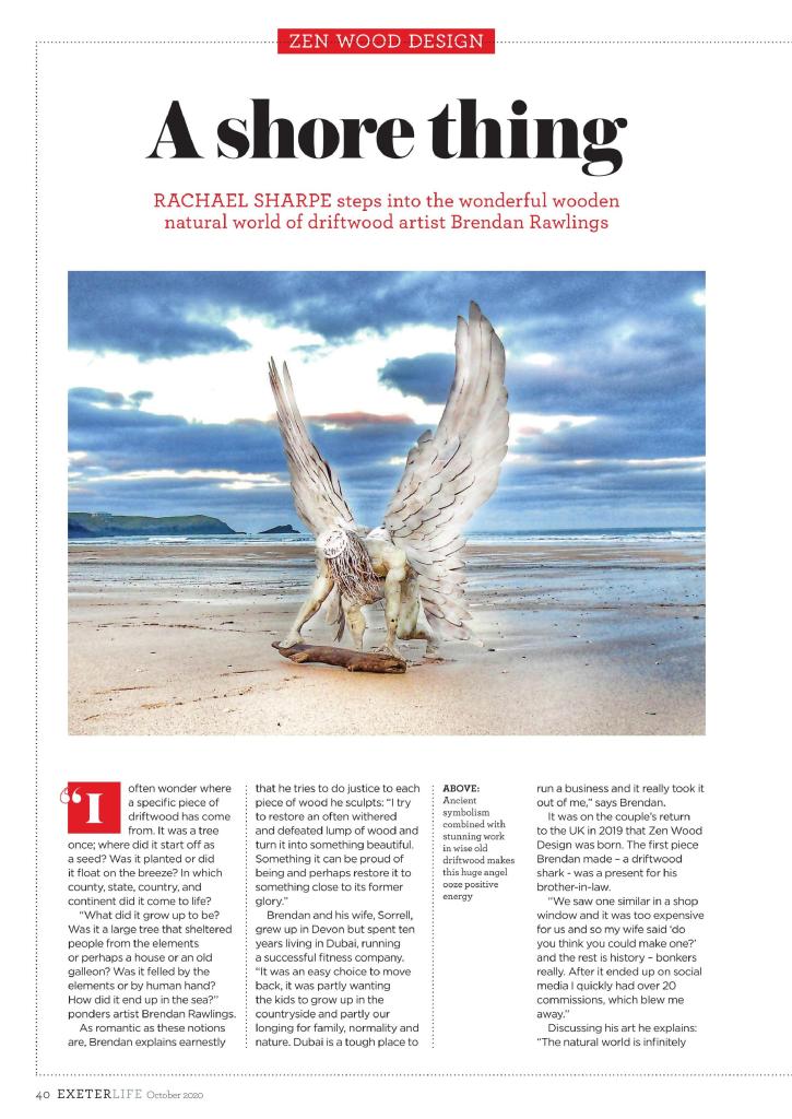 This summer I met Brendan Rawlings of Zen Wood Design and discovered his astonishing driftwood art. Below is the finished piece, published in Exeter Life.