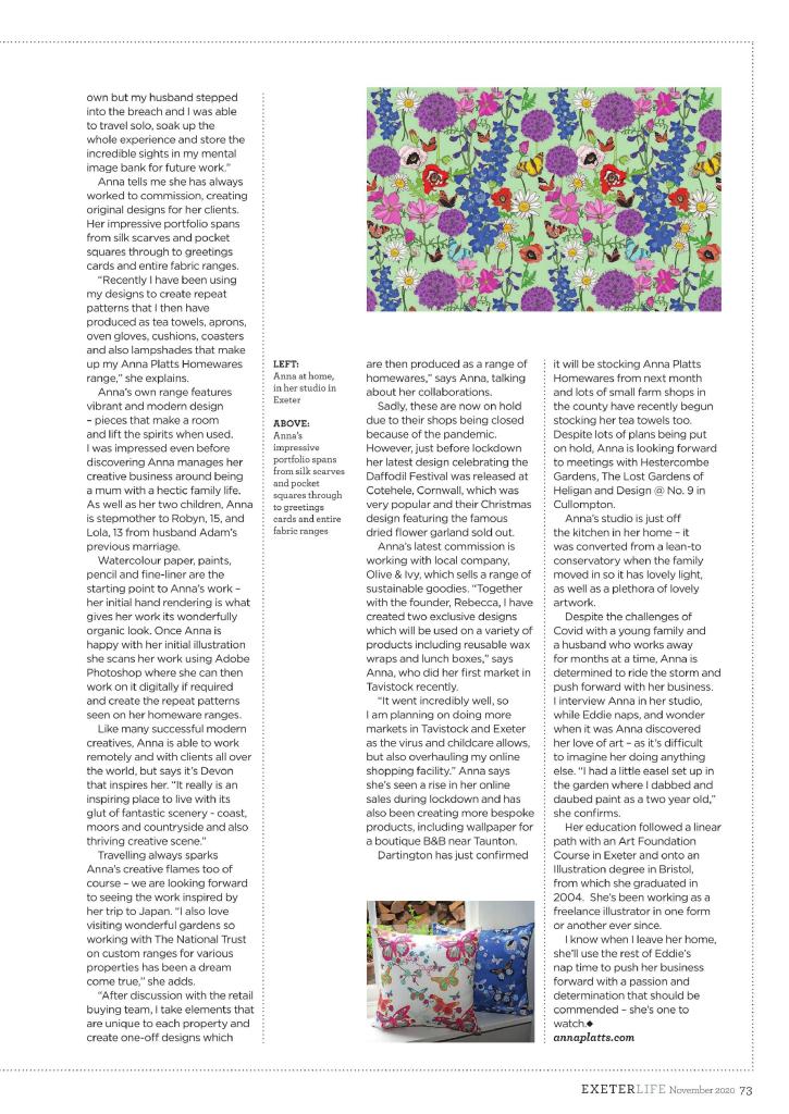 It’s always lovely to interview a fellow working mother and especially so in the case of illustrator, Anna Platts. My feature, published in the November issue of Exeter Life delves into Anna’s impressive creative business, which she juggles with a young family. Click on the pages above to read.