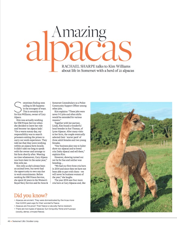 In the October issue of Somerset Life magazine, which you can read here for free, I talk to Kim Williams about here life in rural Somerset with a herd of 21 alpacas…